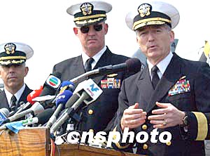 美國(guó)太平洋第七艦隊(duì)?wèi)?zhàn)斗群司令凱利(右一)在“小鷹”號(hào)航空母艦舉行的歡迎儀式上,向媒體介紹該有關(guān)情況及回答記者問(wèn)。作者:錢興強(qiáng)