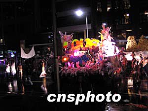 澳洲第一大城市悉尼6日晚舉行同性戀大游行,十萬人冒雨上街看熱鬧。幾十輛花車、數(shù)千人的化裝游行隊伍在雨水中緩緩行進。最后一輛花車上書“要愛不要戰(zhàn)爭”! ≈行律缬浾 劉雨生 攝