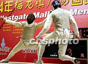 三月八日,中國“劍客”董兆致(左)在上海梅龍鎮(zhèn)廣場舉行的二○○四國際劍聯(lián)男女花劍世界杯大獎(jiǎng)賽男子個(gè)人花劍決賽中,擊敗德國的Bissdorf Ralf獲得冠軍。作者:湯彥俊