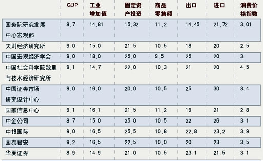 2003年中國全年GDP增長9.1%,達到1997年以來GDP的最高增速。目前經(jīng)濟學(xué)界較為一致的看法是,中長期中國經(jīng)濟仍可保持強勁的增長勢頭,但對于GDP能否保持去年的增速或者超過去年的增速卻有很大分歧。一種觀點認為,2003年經(jīng)濟增長達到短周期波動的波峰,2004年將進入短周期波動的收縮期,經(jīng)濟增長速度將出現(xiàn)小幅度下降。另一種觀點認為,中國經(jīng)濟可能突破傳統(tǒng)的周期,2004年GDP增速可能再創(chuàng)新高。而《證券市場周刊》特邀10家機構(gòu)所作的2004年一季度宏觀經(jīng)濟預(yù)測也體現(xiàn)了這兩種不同的觀點。
