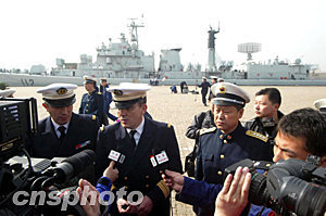北海艦隊(duì)某驅(qū)逐艦支隊(duì)112號(hào)導(dǎo)彈驅(qū)逐艦對(duì)來訪艦艇編隊(duì)進(jìn)行海上迎接、引導(dǎo)、執(zhí)行海上禮儀。某驅(qū)逐艦支隊(duì)544護(hù)衛(wèi)艦與112號(hào)導(dǎo)彈驅(qū)逐艦一道?吭诖a頭陪同來訪編隊(duì)。