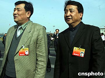 三月十二日下午,全國(guó)政協(xié)十屆二次會(huì)議舉行閉幕會(huì),全國(guó)政協(xié)委員、著名相聲演員姜昆(右)等委員出席。中新社記者:張勤
