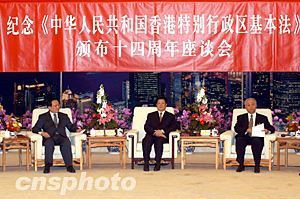 盛華仁說,香港基本法頒布十四年來的歷史表明,這部法典的偉大意義在于,它把鄧小平關(guān)于“一國兩制”的偉大構(gòu)想,用法律形式完整地體現(xiàn)出來,并在香港成為事實(shí)。依照基本法所開創(chuàng)的“一國兩制”的生動(dòng)實(shí)踐,是世界歷史上前所未有的偉大創(chuàng)舉。事實(shí)證明,香港基本法是香港長期繁榮穩(wěn)定的根本保證。