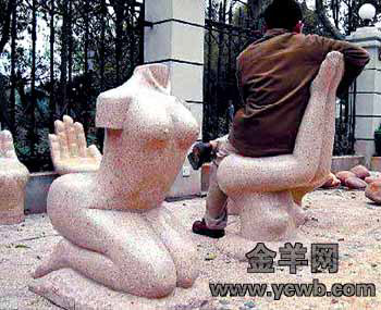 中新網(wǎng)3月13日電 “夢澤園小區(qū)竟然擺放了兩張女性裸體造型的石椅,其中一張是下跪的女人翹著臀部當(dāng)椅子,另一張則是女性倒立舉起大腿給人當(dāng)靠背,真是丑死了!”昨日,家住長沙蓉園社區(qū)的陳老師指著兩張人體藝術(shù)石椅,憤憤不平地說。