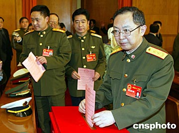 十屆全國人大二次會議三月十四日在北京人民大會堂舉行閉幕式,解放軍人大代表投票表決“憲法修正案草案”。中新社記者:毛建軍