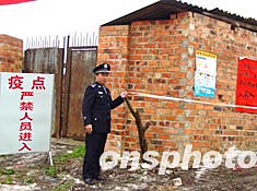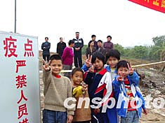 閉家紅、李志基夫婦牽著年幼的兒子,今天上午十時(shí)滿臉笑容走出了警方設(shè)置的警戒線,三十九天來,他們一家和其他六戶養(yǎng)殖戶二十二人一直被隔離在廣西南寧市興寧區(qū)北湖園藝場的一個(gè)小山丘上,因?yàn)樵谒麄兙幼〉倪@個(gè)山丘上發(fā)生了高致病性禽流感疫情。