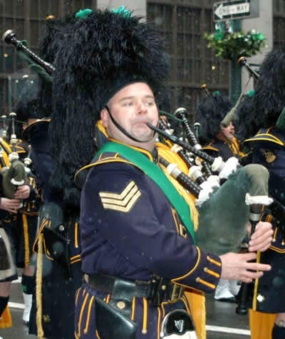 十七日,雖然嚴(yán)寒,卻沒有影響紐約愛爾蘭人慶祝節(jié)日的興致,愛爾蘭風(fēng)笛手仍舊穿著花格短裙沿著曼哈頓五大道緩緩行進(jìn)。引人注目的還有游行隊伍中身著迷彩服的美國戰(zhàn)士,這是往年并不多見的一只隊伍,美伊戰(zhàn)爭后,這只隊伍成為美國愛爾蘭裔人的驕傲。