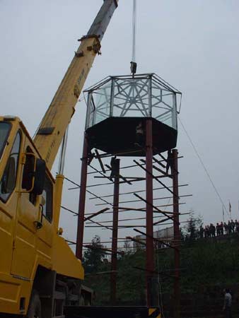 2∶45,三位雅安市公證處的公證人員對(duì)陳建民的隨身物品進(jìn)行了嚴(yán)格的檢查,在確定沒(méi)有任何違背挑戰(zhàn)活動(dòng)承諾的物品后,陳建民才被吊車送進(jìn)了14米高的玻璃房。