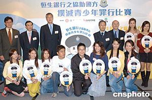 《恒生銀行之協(xié)助警方撲滅青少年罪行比賽2004》舉行揭幕儀式。出席儀式的主禮嘉賓及眾歌星藝員于揭幕儀式上合照。作者:鄧慶樂(lè)
