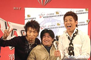 三月二十五日,羽泉組合在北京宣布,將于今年五月在北京首都體育館舉行名稱為“紅五月”的演唱會。圖為發(fā)布會上羽泉組合與歌迷一道接受中國歌曲排行榜的頒獎。作者:高遠