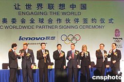 三月二十六日,聯(lián)想集團(tuán)與國際奧委會(huì)在北京簽署合作協(xié)議,宣布正式成為第六期國際奧委會(huì)全球合作伙伴(簡稱TOP),這是奧運(yùn)歷史上中國企業(yè)首次獲此資格。國際奧委會(huì)市場開發(fā)委員會(huì)主席海博格、北京奧組委主席劉淇、中國奧委會(huì)主席袁偉民、聯(lián)想集團(tuán)董事局主席柳傳志等出席了簽約儀式。中新社記者:武仲林