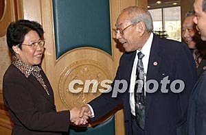 四月二日,中國國務(wù)院僑辦主任陳玉杰(左)在北京新世紀(jì)飯店會(huì)見來華的美國安良工商會(huì)訪問團(tuán)全體成員。中新社記者:史利