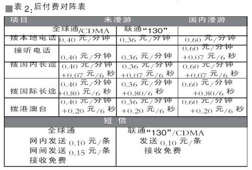 目前,包括全球通、聯(lián)通CDMA世紀133、聯(lián)通130三種后付費業(yè)務(wù)中,130的資費最低,為0.36元/分鐘,但是其在北京的用戶數(shù)量和信號都遠遠少于前兩種。