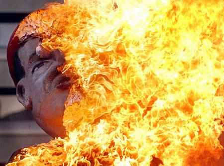 中新網(wǎng)4月13日電 據(jù)路透社報(bào)道,4月11日,委內(nèi)瑞拉總統(tǒng)查韋斯的反對者正在首都加拉加斯燃燒這位左翼領(lǐng)導(dǎo)人的肖像。兩年前的4月11日,一場短暫的政變將查韋斯暫時(shí)推翻下臺(tái)。委內(nèi)瑞拉政府和反對派相互指責(zé)對方是導(dǎo)致這場政變引發(fā)的暴亂當(dāng)中數(shù)十人死亡的罪魅禍?zhǔn)住#ù猴L(fēng))