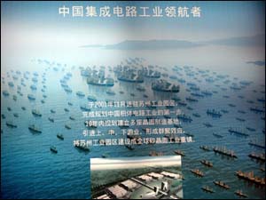 宋濤在鄭和艦隊帷幕前向記者介紹說,和艦科技是一家外資獨資企業(yè),注冊資本三點五億美金,二○○一年十一月進駐蘇州工業(yè)園區(qū),第一座晶圓制造廠占地一點三平方公里,而蘇州給和艦科技留下了一百十公頃土地。