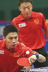 四月十三日,奧運乒乓球預(yù)選賽亞洲區(qū)男子雙打第二階段比賽北京海淀體育館繼續(xù)舉行。中國男雙選手馬琳(右)、陳杞輕松戰(zhàn)勝一對香港選手。中國隊的兩對男子雙打選手由于在第一階段小組賽中以全勝戰(zhàn)績進入第二階段比賽,而在第二階段當(dāng)中他們各自僅負一場,成績位列參加循環(huán)賽8對選手的前兩位,雖然他們在今天晚上還有比賽,但從理論上講他們已拿到進軍雅典的入場券。中新社記者:盛佳鵬