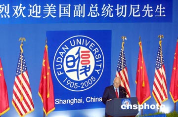 中新網(wǎng)4月15日電 來自上海的最新消息說,美國(guó)副總統(tǒng)切尼15日上午在復(fù)旦大學(xué)開始演講。