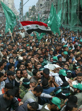3月22日,近萬名哈馬斯的支持者和巴民眾涌上加沙街頭,為遭以軍暗殺的“哈馬斯”精神領(lǐng)袖亞辛舉行葬禮,更抗議以色列不光彩的暗殺。28天后,巴勒斯坦各武裝派別的支持者們又來給蘭提斯送行。當他們擁著蘭提斯的尸體,鳴著槍從加沙師法醫(yī)院走向阿爾納斯郊區(qū),他們心中充斥的是憂傷?是憤怒?是恐懼?還是茫然?