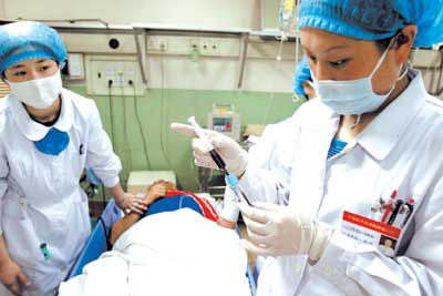 下午3時25分,307醫(yī)院急診樓外停放著兩輛999急救車,有5名工人已被送進急診室內(nèi)。在急診大廳右側(cè)的一間急救室內(nèi),一名50多歲的老人,不停地抽搐著,病床旁放著一個裝嘔吐物的大桶,兩名比較嚴重的工人則處于昏迷狀態(tài),十幾名醫(yī)生正在進行搶救。