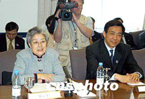 中國(guó)國(guó)務(wù)院副總理吳儀(左)和商務(wù)部部長(zhǎng)薄熙來(右)四月二十一日出席在美國(guó)華盛頓舉行的第十五屆中美商貿(mào)聯(lián)委會(huì)。作者:余東暉
