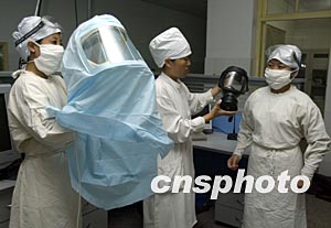 北京地壇醫(yī)院重癥監(jiān)護室(ICU)的護士,穿戴好防護裝準備進入收治SARS疑似患者的病房。地壇醫(yī)院是北京市權(quán)威的老資格傳染病醫(yī)院,在2003年承擔了眾多SARS患者的治療搶救重任,并在2003年8月將去年全國最后一名SARS患者治愈。中新社記者:任晨鳴