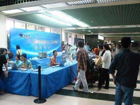 博鰲亞洲論壇2004年年會于4月24日在海南博鰲開幕。本次論壇年會主題為“亞洲尋求共嬴——一個對世界開放的亞洲”,表明2004年博鰲亞洲論壇年會將在全球背景下,探討亞洲各國和地區(qū)區(qū)域經(jīng)濟合作問題,尋求亞洲共同進步的有效途徑。圖為忙碌的?诿捞m機場博鰲亞洲論壇年會接待處。(春風)