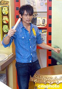 臺灣人氣偶像歌星周杰倫5月7日在香港出席其代言廣告One2free灣仔新店開幕,周杰倫并以打鼓助慶。作者:鄧慶樂