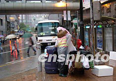 5月8日,香港天文臺上午7時20分一度發(fā)出今年首個黑色暴雨警告,歷時40分鐘。雖然黑色暴雨警告生效,但一名清潔工在街頭仍然工作。作者:譚達明