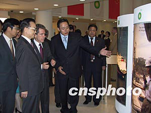正在英國(guó)訪問的溫家寶總理9日下午前往英國(guó)石油公司參觀,正在聽取該公司總裁布朗勛爵介紹中英石油合作項(xiàng)目情況。朱大強(qiáng) 攝