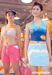 樂(lè)壇新星官恩娜(右)、歌星陳見(jiàn)飛5月12日在香港出席全港最大的運(yùn)動(dòng)專門店GigaSports SuperStore開幕,兩人客串模特展示最新泳裝。