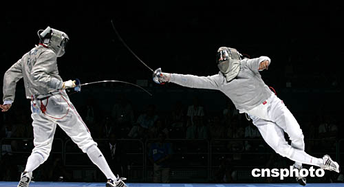 在當?shù)貢r間8月19日舉行的男子配劍團體賽中,法國隊戰(zhàn)勝意大利隊奪得冠軍。圖為兩隊選手比賽時場面。