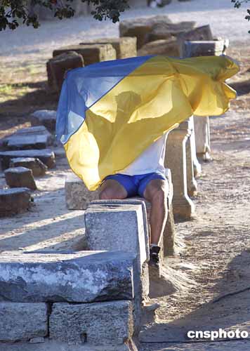 當?shù)貢r間8月18日,烏克蘭選手比洛諾格獲得男子鉛球比賽冠軍后,獨自一人披著國旗坐在雅典遺留的古廢墟之中。