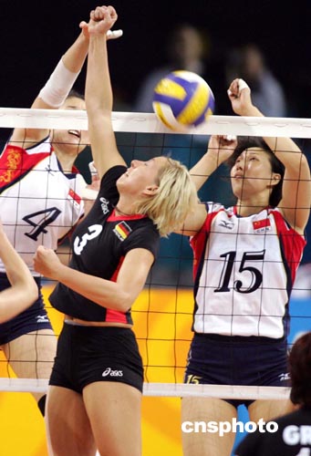 中新社雅典八月二十日電 中國女排在奧運會女排預(yù)賽第四輪中憑借穩(wěn)定的發(fā)揮以三比0輕松戰(zhàn)勝德國隊。