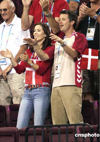 圖為丹麥王儲弗雷德里克攜王妃瑪麗來到奧運比賽現(xiàn)場,觀看當(dāng)?shù)貢r間19日舉行的手球預(yù)賽,該比賽在丹麥與西班牙之間進(jìn)行。