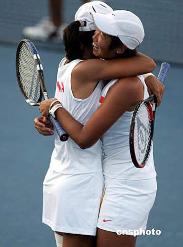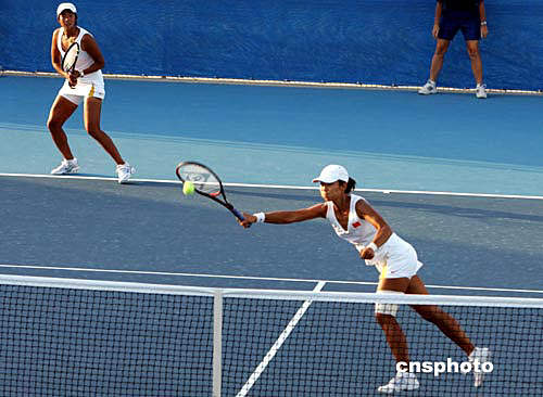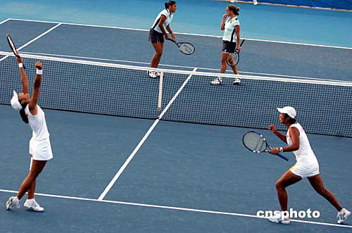 雅典當(dāng)?shù)貢r(shí)間8月20日傍晚,中國網(wǎng)球選手孫甜甜、李婷(前)在半決賽中以九比七戰(zhàn)勝阿根廷選手,歷史性地闖入奧運(yùn)會(huì)女子網(wǎng)球雙打決賽。中新社記者:任晨鳴