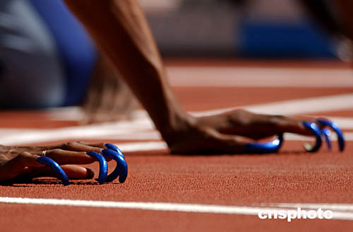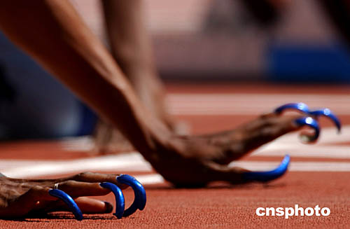 美國“女飛人”蓋爾-德弗斯第五次出征奧運會,她曾在25屆和26屆奧運會上連續(xù)贏得100米短跑金牌。圖為她的那個起跑前獨一無二的預備動作——用手背貼地而彎起長長的美麗指甲。