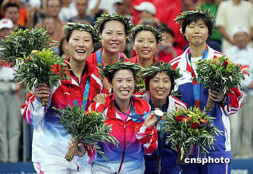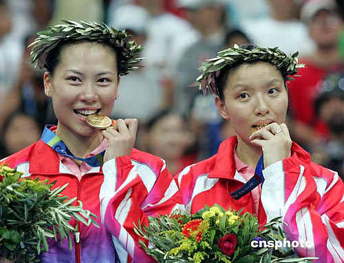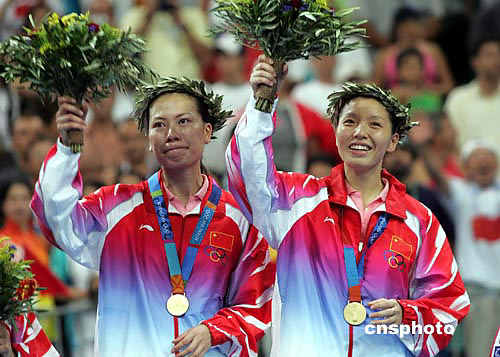 中新社雅典八月二十一日電 廣東球員張潔雯/楊維今天在奧運(yùn)會(huì)羽毛球女雙決賽中,戰(zhàn)勝世界冠軍黃穗/高崚,奪得金牌。