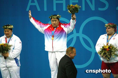 中新社雅典八月二十一日電(記者 宋方燦)雅典奧運會舉重賽場今天下午又出一枚金牌,中國選手唐功紅在女子七十五以上公斤級的比賽中以過人的氣勢,以三百零五公斤的總成績奪取金牌,同時打破挺舉和總成績的世界紀錄。