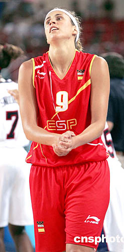 圖為當(dāng)?shù)貢r(shí)間8月20舉行的女子籃球賽中,西班牙隊(duì)員在球隊(duì)不敵美國(guó)隊(duì)后扼腕痛惜。