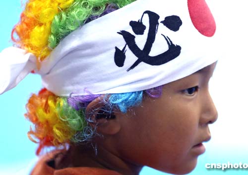 當(dāng)?shù)貢r(shí)間8月22日舉行的女子72公斤級(jí)摔交比賽場(chǎng)邊,一個(gè)打扮引人注目的小孩在為自己國(guó)家的運(yùn)動(dòng)員們加油。