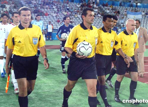 當?shù)貢r間21日,在阿根廷與哥斯達黎加之間進行了一場足球四分之一決賽。圖為該場比賽的主裁判Kyros VASSARAS以及三位助理裁判。