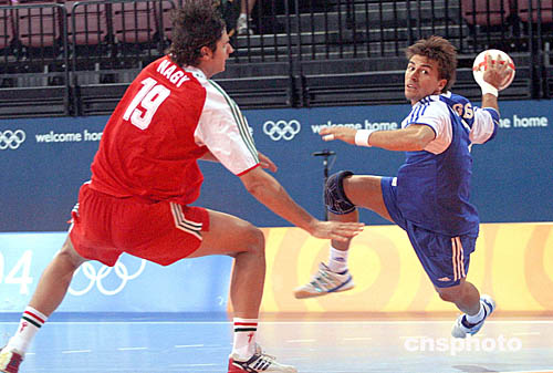 在當(dāng)?shù)貢r間8月22日舉行的男子手球賽中,匈牙利隊以26比22戰(zhàn)勝希臘隊。圖為匈牙利隊的19號選手Laszlo Zoltan NAGY。