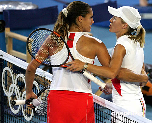 在當(dāng)?shù)貢r(shí)間8月21日舉行的女子網(wǎng)球賽中,比利時(shí)小將海寧戰(zhàn)勝法國名將毛瑞斯莫折桂。圖為賽后兩名選手非常友好的擁抱。