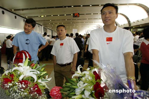 8月23日,在雅典奧運(yùn)會(huì)與金牌失之交臂的中國男子花劍著名三劍客葉沖、董兆致和王海濱回到北京,在首都國際機(jī)場(chǎng)受到人們的熱烈歡迎。中新社記者:盛佳鵬