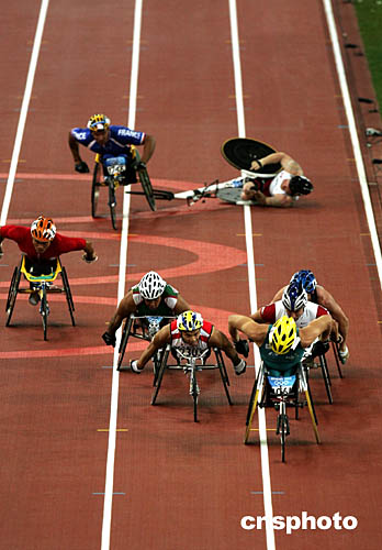 圖為在當(dāng)?shù)貢r間8月22日舉行的男子1500米輪椅表演賽中,加拿大選手Jeffrey Adams在摔倒在地后毅然爬起繼續(xù)比賽,體現(xiàn)了奧運(yùn)不屈不饒的精神。