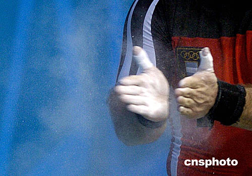 圖為在當?shù)貢r間8月23日舉行的男子94公斤級比賽中,一選手上臺的鏡頭。