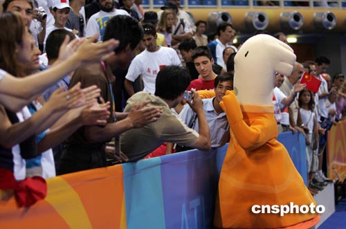 當?shù)貢r間八月二十三日下午,在雅典奧運乒乓球賽場,中國觀眾與吉祥物“費沃斯”親密接觸。中新社記者:毛建軍