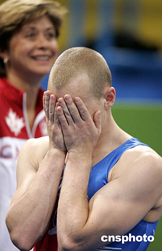 圖為加拿大選手休費(fèi)爾特(SHEWFELT Kyle)以9.787分的成績(jī)奪得男子自由體操冠軍后潸然淚下的鏡頭。