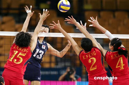 中新社雅典八月二十四日電(記者 宋方燦)在今日進行的首場奧運會女排四分之一決賽中,中國女排在與日本隊的比賽中打出了自己的氣勢,以三比零干凈利落地拿下對手。三局比分為二十五比二十,二十五比二十二和二十五比二十。