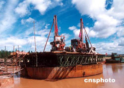 8月下旬,中鐵十四局集團三公司的工人們在呼準(zhǔn)鐵路黃河特大橋施工現(xiàn)場加緊作業(yè)。呼(呼和浩特)準(zhǔn)(準(zhǔn)格爾)鐵路全長117公里,它的建設(shè)將為中國重要的能源工業(yè)基地----鄂爾多斯市的煤炭資源運輸開辟可靠的渠道,促進內(nèi)蒙古西部地區(qū)的經(jīng)濟發(fā)展。呼準(zhǔn)鐵路黃河特大橋是全線重點工程,主體工程預(yù)計2005年10月底完成。作者:孔祥文